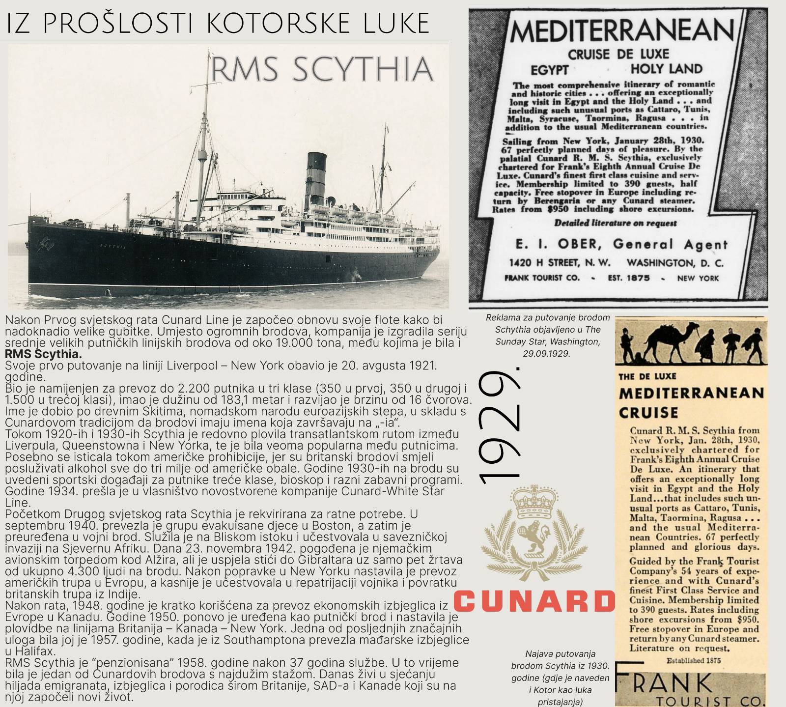 „Scythia je najavila obilazak Mediterana za sezonu 1930. sa destinacijom Kotor u svom itinereru. Kompanija Cunard cijeli vijek svoje brodove dovozi u Kotor. O počecima pročitajte u današnjoj objavi.“